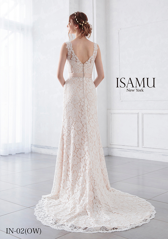 ベージュピンクのストレッチサテンのアンダー素材と、クラシカルな花柄のレースとのコンビネーションが絶妙な、スレンダードレスです。ウエストには豪華なビジューをもちいた、ベルトが花嫁様の心を響かせます。